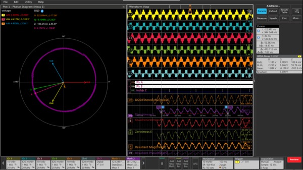 - Supports DQ0 measurements with the phasor plot and resultant vector navigation using oscilloscope cursors.