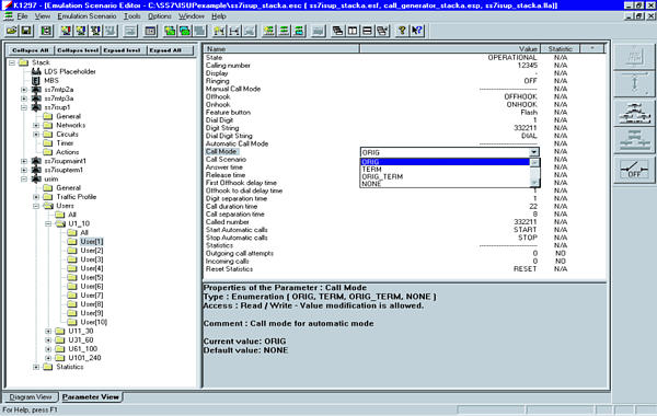 All parameters - for example, phone numbers, IMSIs, and more - are configured through menus. Once activated, the Network Element Emulation will automatically respond to incoming messages and/or initiate calls and procedures. Outgoing calls or procedures can be initiated interactively with a mouse click, or with the help of a simple script interface by defining specific call scenarios, as shown in Figure 5.