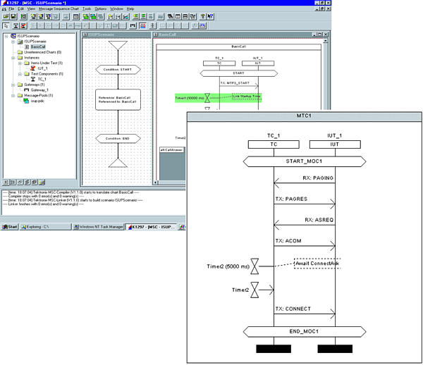 As shown in Figure 7, the MSC is used to define the message flow of a test case. The messages (indicated by arrows in the chart) are defined within the MBS.