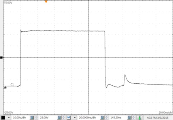 The following figures show typical leading edge and trailing edge waveforms. The displays are set to 10 V/div and 200 ps/div.