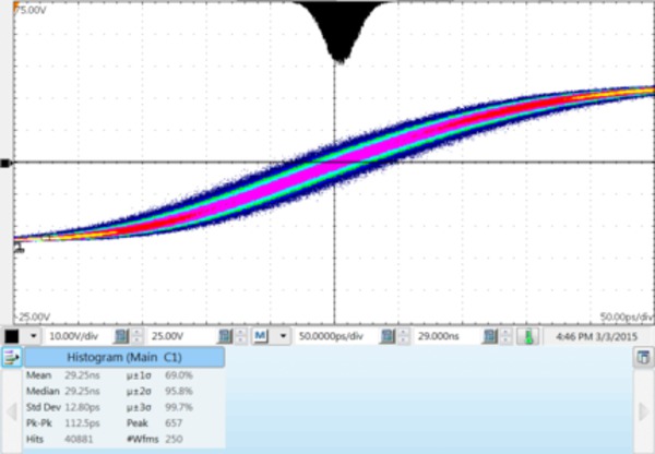 Fixed 115 ns delay trigger, jitter measures 6.8 psrms