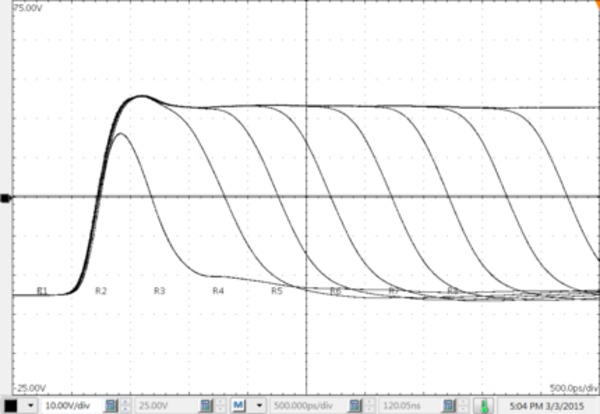 The following figure shows an adjustable duration waveform from 1 ns to 100 ns. The display is set to 10 V/div and 500 ps/div.