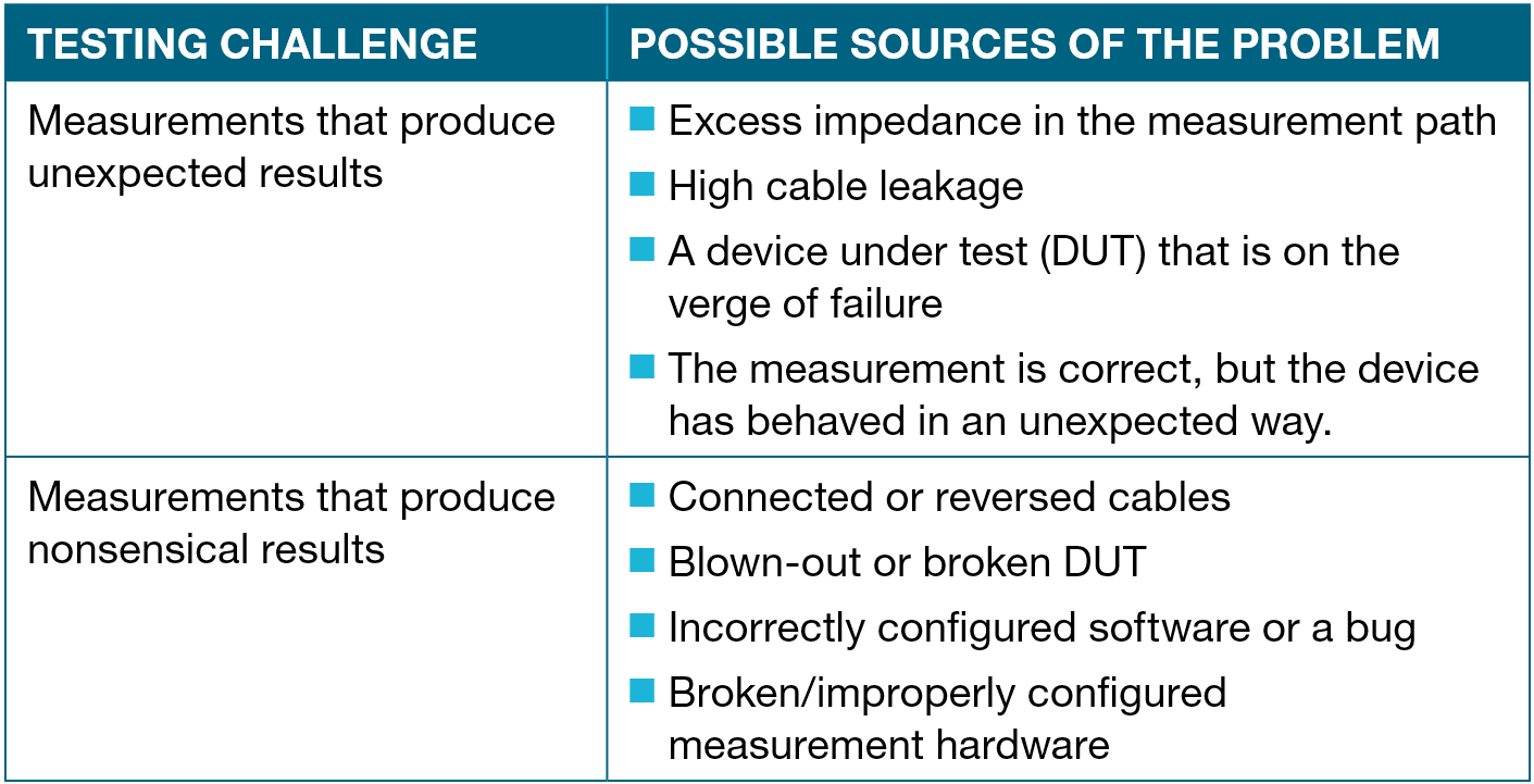 For low resistance measurements, the traditional twowire technique incorporates unwanted lead resistance into the measurement. The test current causes a small but significant voltage drop across the lead resistances, so the voltage measured by the meter isn’t exactly the same as the voltage directly across the test resistance, leading to significant error. With the four-wire (Kelvin) connection method shown here, the test current is forced through the test resistance and through one set of test leads; the voltage across the DUT is measured with a separate set of sense leads. Any small currents that flow through the sense leads are typically negligible, so the voltage measured by the source measure unit (SMU) instrument is essentially the same as the voltage across the resistance. Voltage-sensing leads should be connected as close to the resistor under test as possible.