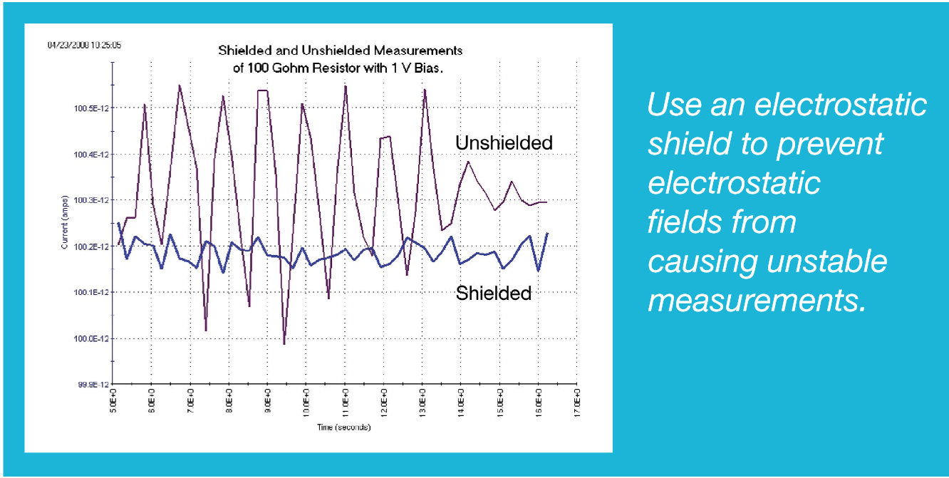 Electrostatic interference occurs when an electrically charged object is brought near an uncharged object. Usually, the effects of the interference are not noticeable because the charge dissipates rapidly at low resistance levels. However, high resistance materials do not allow the charge to decay quickly, and unstable measurements may result. Typically, electrostatic interference is an issue when making current measurements ≤1 nA or resistance measurements ≥1 GΩ. To reduce the effects of the fields, the circuit being measured can be enclosed in an electrostatic shield. Note the dramatic difference shown between an unshielded and a shielded measurement of a 100 GΩ resistor. The unshielded measurements are much noisier than the shielded measurements.