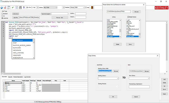 ACS features Script Editor, an independent tool with graphical user interface for developing Python code and TSP® scripts for performing instrumentation control, data analysis, and system automation. It offers intuitive ways to create and develop GUI design and manage user libraries and modules.