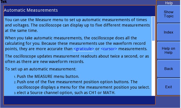 Встроенное меню справки содержит важную информацию о всех функциях и характеристиках осциллографа. Язык справочной системы соответствует языку интерфейса пользователя.