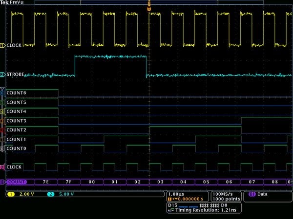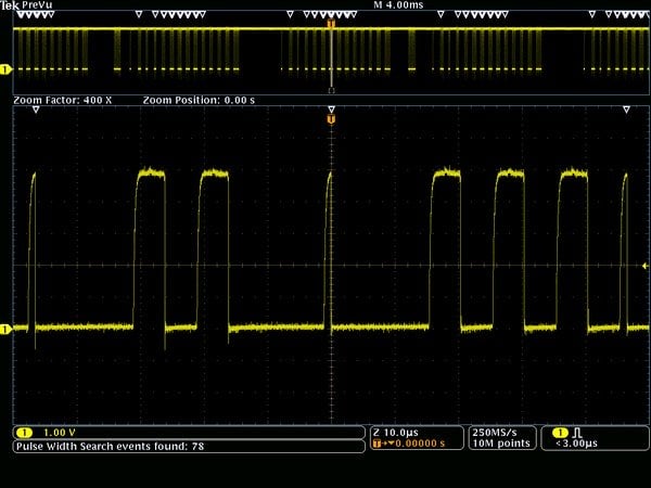 Обнаружение неисправности устройства – это лишь первый шаг. Теперь нужно захватить интересующее событие, чтобы установить причину его возникновения. В осциллографе серии MDO4000C предусмотрено более 125 комбинаций запуска, обеспечивающих полный набор вариантов для ускорения поиска интересующего события. Запуск может осуществляться по ранту, логической комбинации, длительности импульса/глитча, нарушению времени установки и времени удержания, последовательным пакетам и данным параллельной шины. Благодаря длине записи до 20 млн. точек, можно захватывать сразу несколько интересующих событий и даже тысячи последовательных пакетов с сохранением высокого разрешения, позволяющего детально рассматривать мельчайшие подробности сигнала и записывать достоверные результаты измерений.
