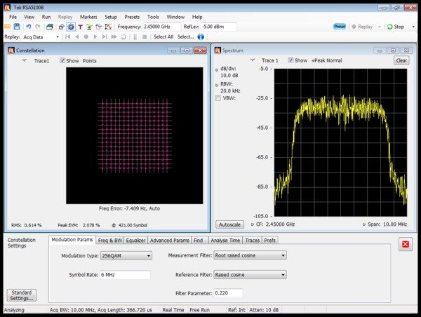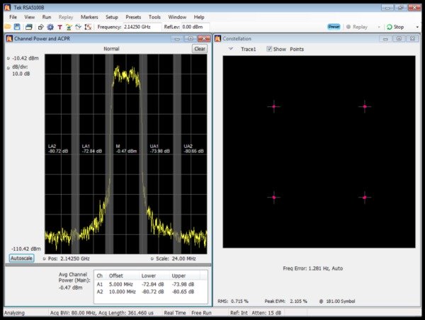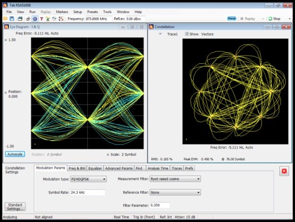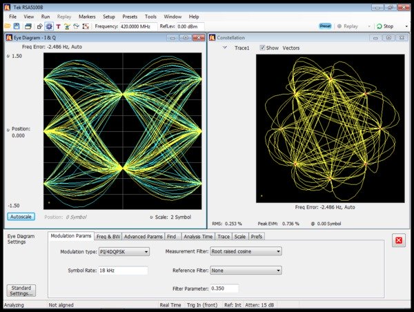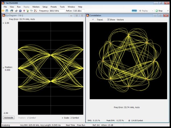 Пользователь может модифицировать констелляционную диаграмму. Доступны следующие цифровые фильтры: приподнятый косинус, корень квадратный из приподнятого косинуса, фильтр Гаусса, фильтр с прямоугольной или линейной характеристикой, кардинальный синус и настраиваемый пользователем КИХ-фильтр.