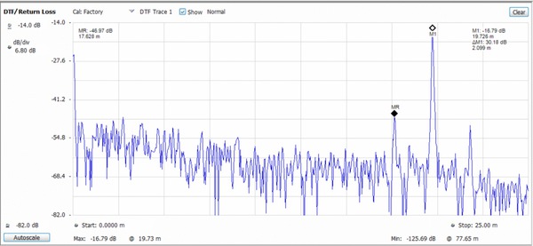 Зависимость потерь на отражение от расстояния в кабелях со смонтированной муфтой и продолжением кабеля. В точке M2 (на расстоянии 17,638 м, MR) находится соединительная муфта, а точка с обозначением M1 на расстоянии 19,725 м указывает конец кабеля.