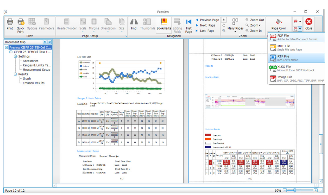 Whereas making notes on a general-purpose spectrum analyzer may be challenging, PC-based test and analysis software simplifies the report generation process. A “report wizard” in EMCVu simplifies report generation by allowing you to specify the information to include in the report, and allowing you to merge multiple test results. Reports may be output in several formats, including PDF, MHT, XLSX and several image formats.
