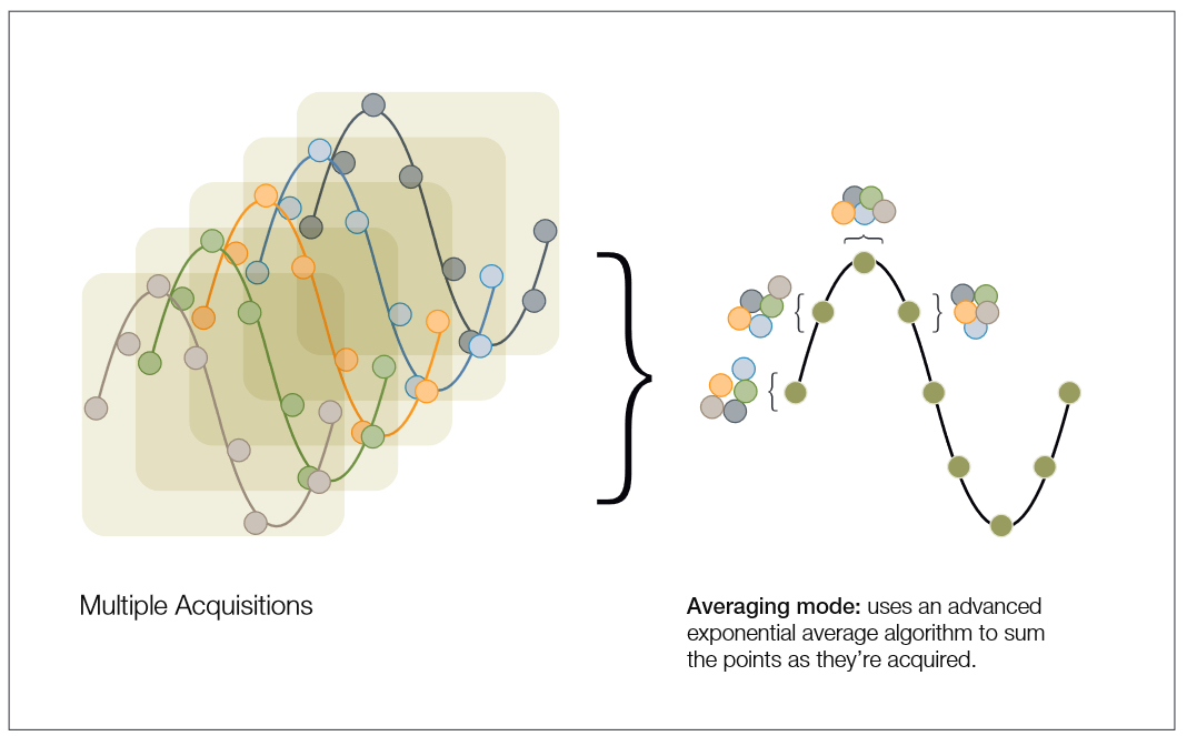 The first is waveform averaging, shown in Figure 10, which averages corresponding samples from subsequent triggered acquisitions. This technique does require a repetitive signal, but provides very effective removal of random noise. And, if the sample rate is very high compared to the frequencies of interest, the effective system bandwidth is not affected.