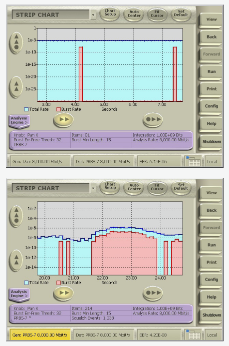 - Strip Chart Analysis: a scrolling graph of error occurrences, updating as measurement progresses with the proportions of burst and bit errors.