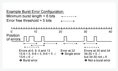 Burst errors are defined by two Error Location Analysis parameters: the minimum burst length and the error free threshold. The minimum burst length determines the minimum number of bits in a burst error but not the minimum number of errors in that burst.