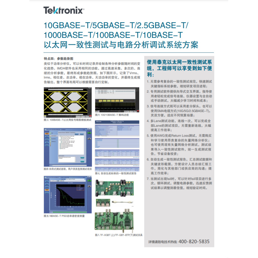 Tektronix 為解決乙太網路相容性測試中的難題,為貴公司推薦配置了以 MSO64 示波器為基礎的 10G/5G/2.5GBASE-T 和 1000/100/10BASE-T 相容性測試及分析除錯系統。