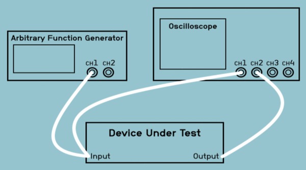 在專案實驗室中,頻率響應是常用的量測。下列圖表顯示任意函數產生器連接至測試板的輸入,而示波器連接至其輸入和輸出,來量測振幅的變更。