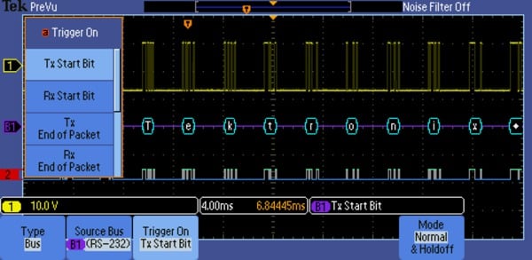 擷取 - 通過 RS-232 匯流排的特定傳輸資料封包觸發。一套完整的觸發功能,包括特定串列封包內容觸發,確保您能迅速擷取目標事件。