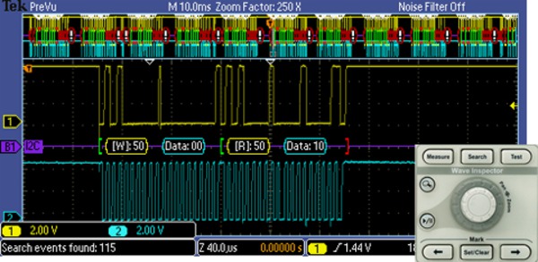 搜尋 - I2C 解碼顯示 Wave Inspector 搜尋位址值 50 的結果。Wave Inspector 控制鈕為檢視與瀏覽波形資料帶來前所未有的效率。