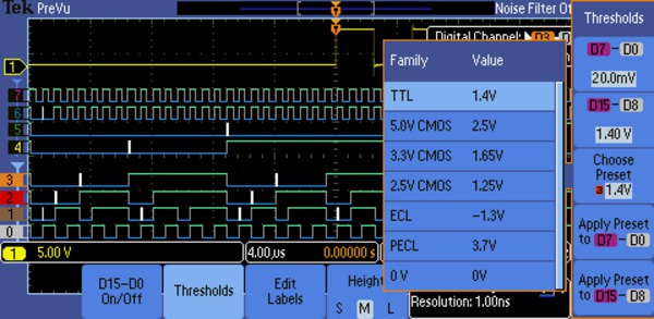 有了色碼數位波形顯示,只要將數位通道放在畫面上同一位置即可建立群組,讓數位通道以群組的方式移動。您可以為八個通道的每個 pod 設定臨界值,最多可支援兩種邏輯系列。