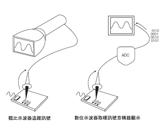 DPO 的第一個 (輸入) 階段類似於類比示波器 (垂直放大器),而其第二個階段則類似於 DSO (ADC)。但是,在類比/數位轉換之後,DPO 與前代產品有很大的不同。