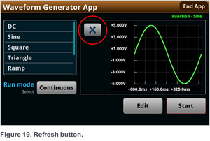 With the output turned on, the “Start” button text will then be replaced by “Stop”. The app constantly checks for this button’s input and will interrupt the output at the end of the cycle if it is pressed. To maximize frequency settings, the output will only be interrupted at the end of the cycle. If this introduces any problems, please note that the output can always be immediately shut off using the “OUTPUT” button on the front panel. When the desired number of cycles is completed (or the user taps the “Stop” button), the app will revert to the output ready state shown in Figure 11.