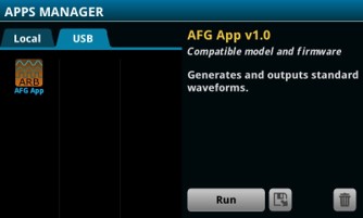 The AFG TSP App simplifies this function generation process and equips the user with the ability to quickly change waveforms and settings. Please reference “Specifications” in the appendix at the end of this document to view the app’s function generation capabilities. To use the app, download the smuafg .tspa file from tek.com and place it into the root directory of your USB drive. Next, insert the drive on the instrument’s front panel. Press the “MENU” button followed by selecting the “Apps” to go to the Apps Manager page. You will now see the app, which can be run directly from the USB or saved to the instrument. Touch “Run” to start the app.