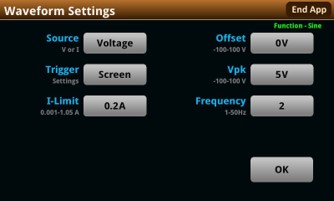 - Current Waveforms: The app can generate current waveforms in addition to voltage. When the app sources voltage or current, it will limit the complementary setting.