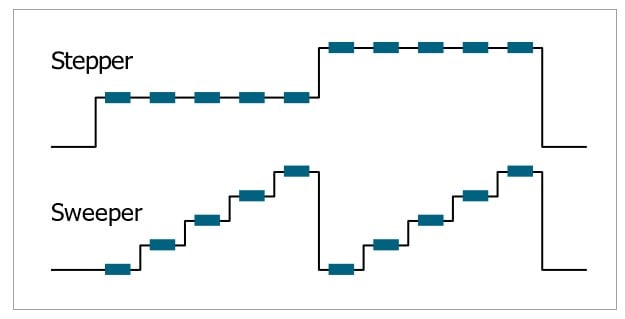 A Stepper channel refers to a channel that performs the “outside sweep” in a nested sweep scenario. For each “step” in the stepper sweep, a different channel can perform an entire sweep. Essentially, a stepper/sweeper configuration is a sweep of sweeps, where the stepper channel applies a bias that changes levels with each step while another channel applies a sweep.