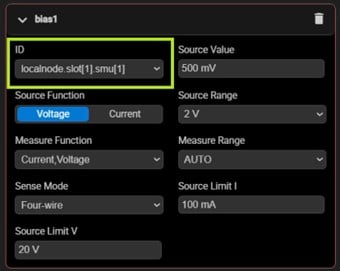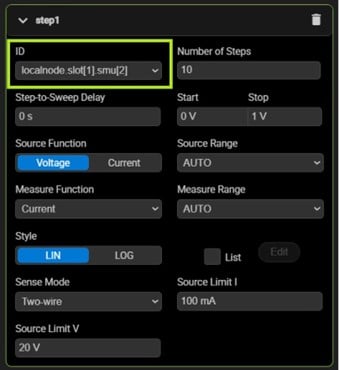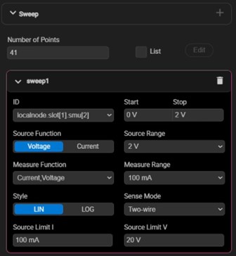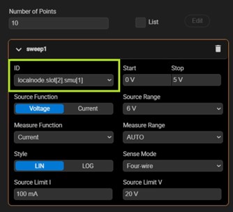 Expand the “Sweep” settings and assign slot[1].smu[2] (the drain channel) as sweep1 using the ID dropdown. Then input the parameters as shown: