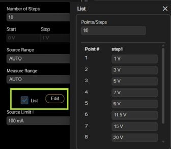 From here, other parameters such as the number of steps, source function, source value, ranges, limits, etc. can also be adjusted. Of note is the “List” checkbox. When checked, the “Edit” button next to the List checkbox allows you to set a custom source value for each step.
