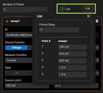 From here, other parameters such as the number of sweep points, source function, source value, ranges, limits, etc. can also be adjusted. Of note is the “List” checkbox. When checked, by clicking the “Edit” button next to the List checkbox, you can set a custom source value for each sweep point, resulting in a custom list sweep.