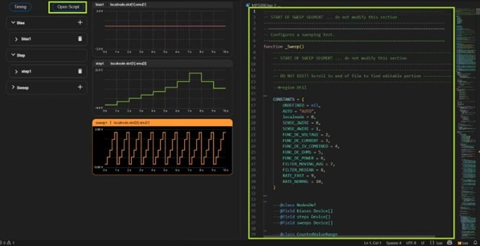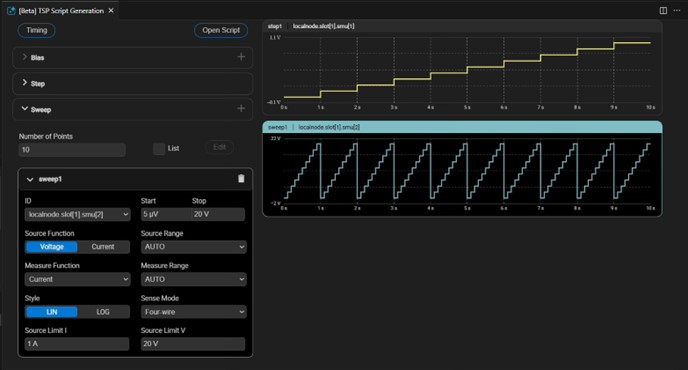 The Automated TSP Script Generation feature can be used to reduce development time and effort for current vs. voltage (I-V) tests on a variety of devices, such as multi- terminal semiconductor components, solar cells, and more. This feature allows you to configure each MP5000 Series SMU or PSU module for a variety of DC bias, step, and sweep sourcing operations and automatically generate a TSP™ script to leverage in your test workflow.