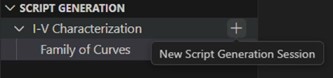Connect to the MP5000 mainframe with TSP Toolkit and create a new script generation session using the Script Generation Pane. Name the new Script Generation session “Family of Curves”.