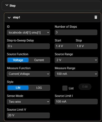 Expand the “Step” settings and assign slot[1].smu[1] (the gate channel) as step1 using the ID dropdown. Then input the parameters as shown: