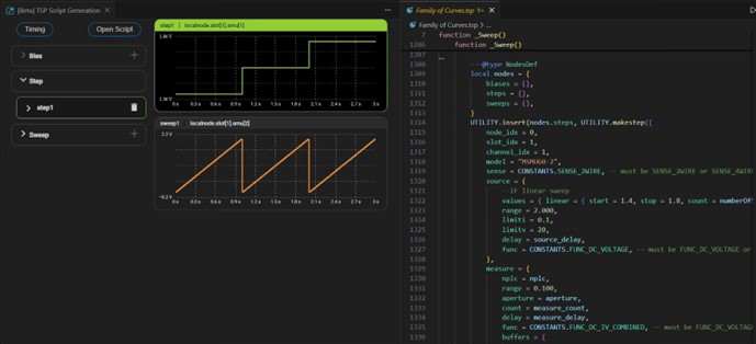 Figure 6: The TSP Toolkit Automated Script Generation UI Configured for a MOSFET Family of Curves Test Alongside the Generated Script.