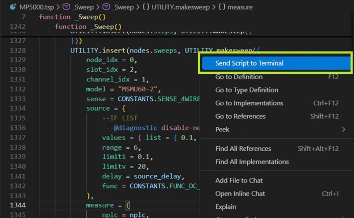 Figure 7: The Generated TSP Script Open in the Editor Window with Active Context Menu Highlighting the “Send Script to Terminal” Command