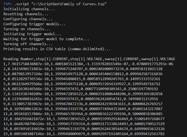 Figure 8: The Resulting Data from the MOSFET Family of Curves Test Being Output to the TSP Toolkit Terminal