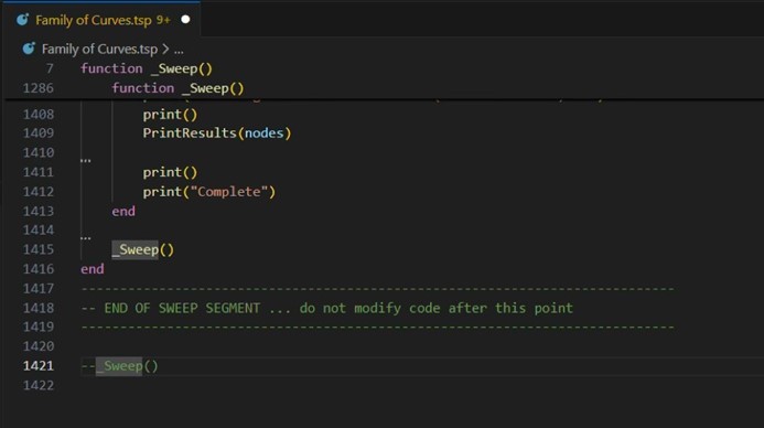 Before running the generated TSP script using Python, open the script with TSP Toolkit and comment out the _ Sweep() function call at the very bottom of the file, as shown on line 1421 in Figure 10. This will prevent the script from running automatically when it is loaded onto the instrument.