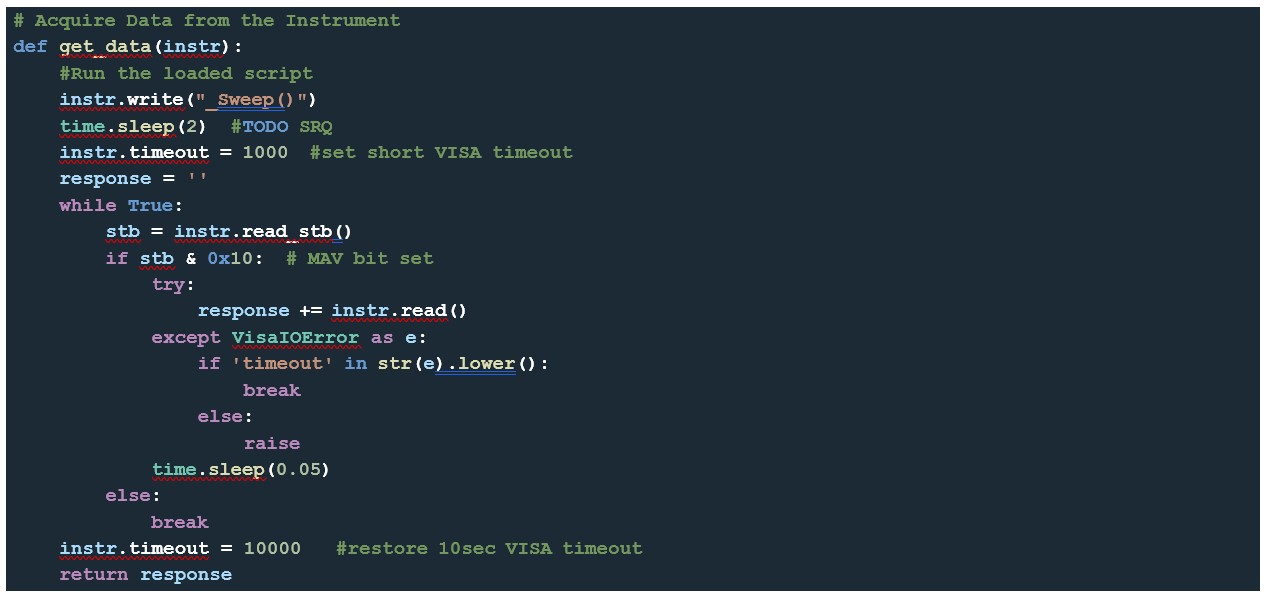 The second function runs the TSP script and collects the data from the instrument: