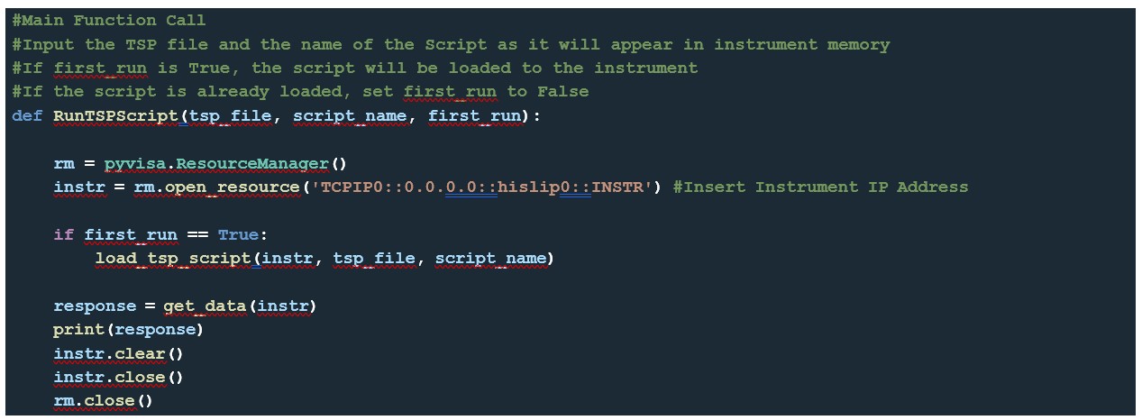 The main function establishes the instrument connection and calls the load _ tsp _ script() and get _ data() functions: