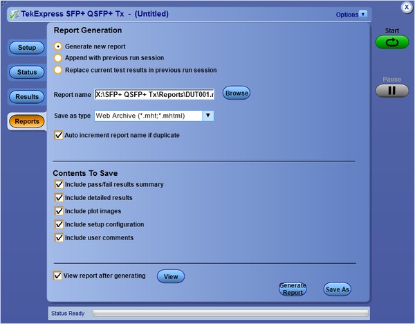 A summary report in .MHT (MHTML) format with Pass/Fail status is automatically generated after tests complete. The report includes test configuration details, waveform plots, and margin analysis to provide more insight into your design.