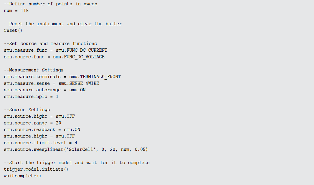 The example sequence of SCPI commands is designed to generate an I-V sweep on a solar cell. You must make the appropriate changes so it will run in your programming environment. In this particular example, the voltage is swept from 0 V to 0.55 V in 56 steps and the resulting PV cell current is measured. The current and voltage readings are stored in the buffer, defbuffer1.