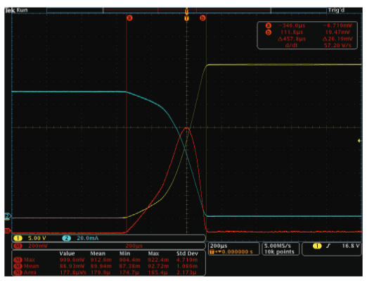 Figure 16 shows an example measurement of switching loss, where yellow channel one is a voltage measurement (in Volts) from a TDP1000 differential probe, cyan channel two is a current measurement (in Amps) from a TCP0030 AC/DC current probe, orange M1 math channel is calculating the instantaneous power (in Watts.) The scale factors and units were all automatically set up by the probes and oscilloscope, with no user interaction.