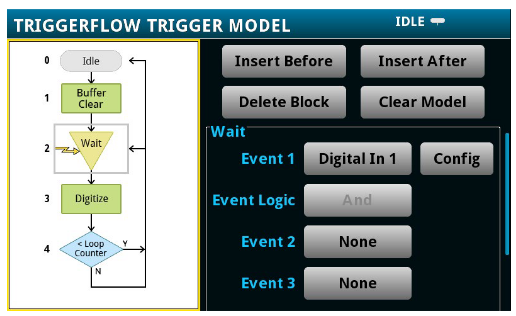 Now consider a series of instruments that must be set up or that must execute their desired actions all at the same time without the overhead of parallel processing on the PC side. One way to implement this parallel operation is through the triggering mechanisms that are available on the test instrumentation used. A variety of options are possible, either through dedicated trigger in and out ports, digital inputs/output lines, or other communication protocol triggers (such as LAN, GPIB, or PCI Express if these options are available). Test instruments will usually have a documented “trigger model” – a flow diagram that shows all the events and actions that are staged to perform the switching and/ or measurement. Studying such models can help users gain a deeper knowledge of the instrument-level processing and may lead to insights on how to optimize the testing scheme further. Even more advantageous is when the user is presented with the ability to circumvent using a dedicated trigger model and define their own to further remove any unnecessary processing that might otherwise slow the instrument.