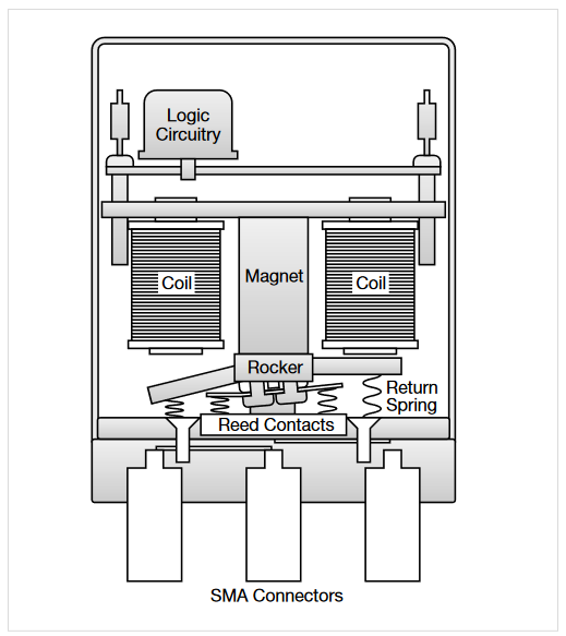 The capacitance between poles degrades AC signal isolation by coupling the signal from pole to pole or relay to relay. These capacitances within relays are a common factor that limit the frequency of switched signals. Specialized contacts and architecture are used in electromechanical relays to obtain good performance for RF and microwave switching up to 40GHz. A typical configuration is shown here, where the common terminal is between two switched terminals. All signal connections are coaxial to ensure signal integrity. In this case, the connectors are the female SMA type. For more complex switching configurations, the common terminal is surrounded by switched terminals in a radial pattern.