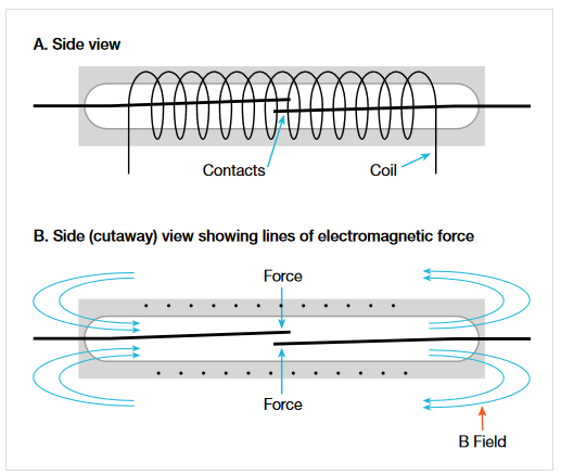 Dry reed relays are also operated by energizing a coil, but in this type of relay, the coil is wound around the switch so that the induced magnetic field closes the switch. Figure 7 shows a simplified representation of a typical reed relay. The switch is made from two thin, flat strips of ferromagnetic material called reeds with contacts on the overlapping ends. Leads are connected to the outside ends of the reeds and the entire assembly is sealed in a hermetic glass tube. The tube holds the leads in place (with a small gap between the contacts for normally open switches). Normally closed switches, less common than normally open, are made in one of two ways. The first method is to make the switch so that the contacts are touching each other. The second method uses a small permanent magnet to hold normally open contacts together. The field from the coil opposes the field of the magnet, allowing the contacts to open.