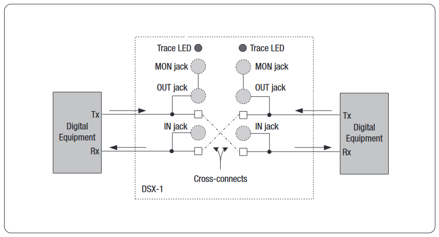The Digital Cross-connect (DSX) panel is a manual cross-connect point that primarily serves as a test access point for DS1 signals and for substituting operational equipment when necessary. This is where technicians will usually connect their T1 test sets to verify the functioning of the T1 link. Using the connections at the monitor ports, the technician can: